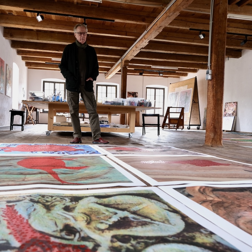 30 Jahre später strahlen die historischen Fassaden in freundlichem Gelb und die großen Räume der Mühle beherbergen Leinwände, Objekte und fein säuberlich geordnetes Material, das darauf wartet, von Pepo Pichler zu Artefakten verarbeitet zu werden. Die Situation im Atelier spiegelt die Vielfalt an Methoden und Techniken wider, die Pichlers Arbeit so unverwechselbar machen.